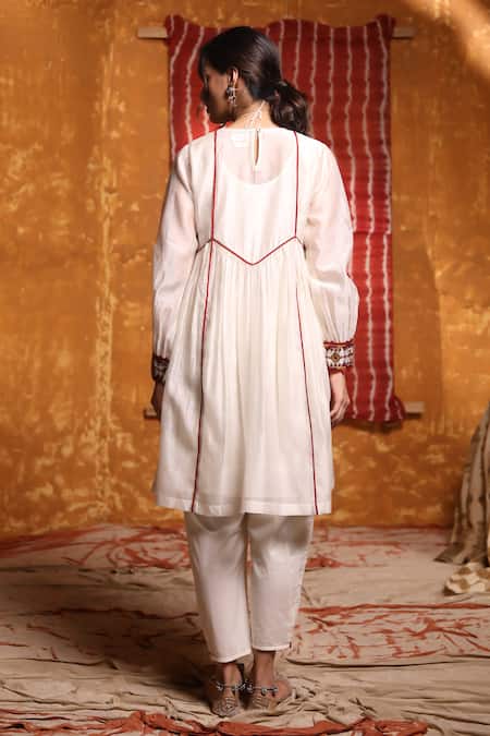 Ivory handloom chanderi short anarkali featuring a smocked yoke and intricate gathered panels. Paired with a salwar and an abstract pattern dupatta.