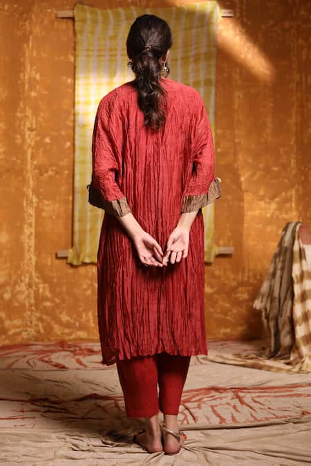 Buy_Shivani Bhargava_Maroon Handloom , Chanderi, Tassels, Kimono Kurta And Pant Set _Online_at_Aza_Fashions