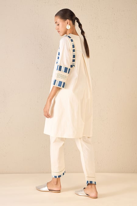 Ivory kurta featuring a V neck, three fourth sleeves, and meadow striped print on the yoke and sleeves hem. Paired with coordinating pants, this set includes side pockets and lace embellishments.
