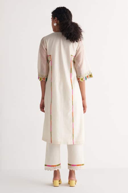 Ivory Chanderi Applique Hand Embroidered Woven V Neck Kurta