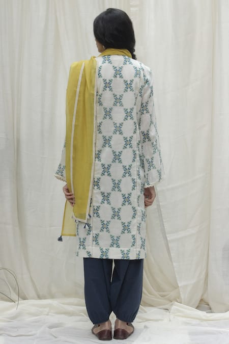 Off white kurta with floral printed motifs & bell sleeves. Paired with salwar & dupatta.