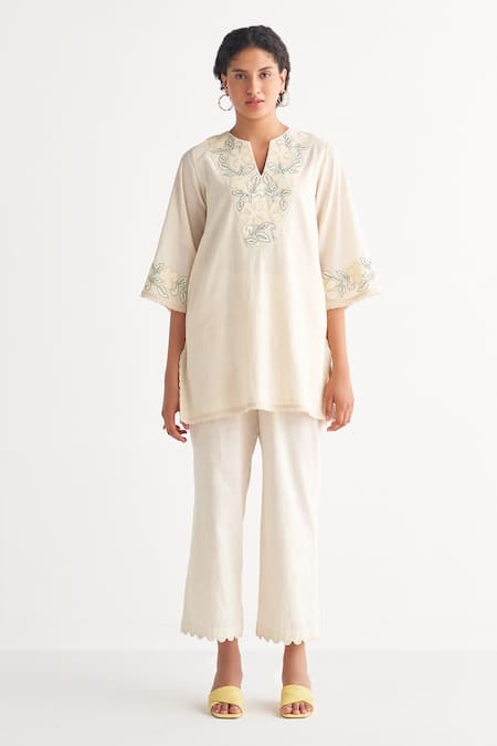Off White Pure Cotton Embroidered Woven Notched Short Tunic