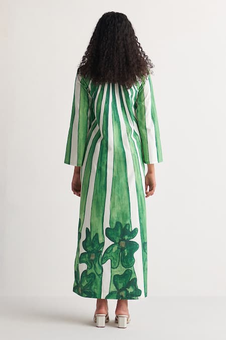 Green Giza Cotton Digital Printed Woven Round Striped And Floral Long Kurta