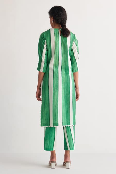 Green woven kurta featuring water color striped digital print, pintuck, and scalloped detailing. Paired with matching flared pant in cotton linen fabric.