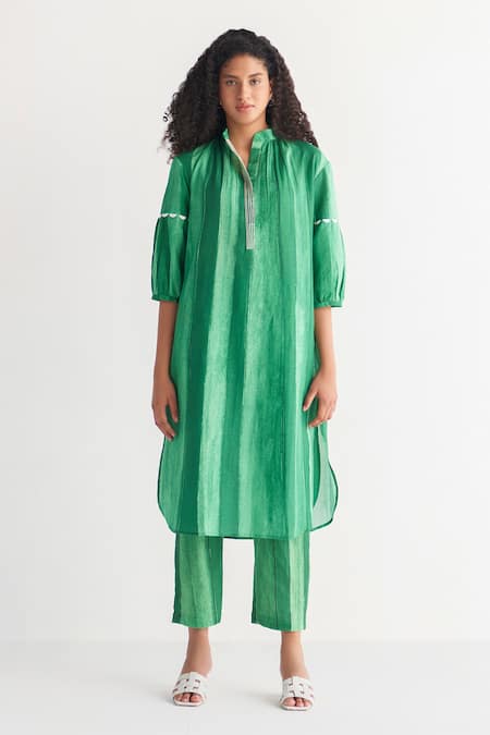 Buy_Shivani Bhargava_Green Cotton, Linen Mandarin Collar Striped Print Dress _Online_at_Aza_Fashions