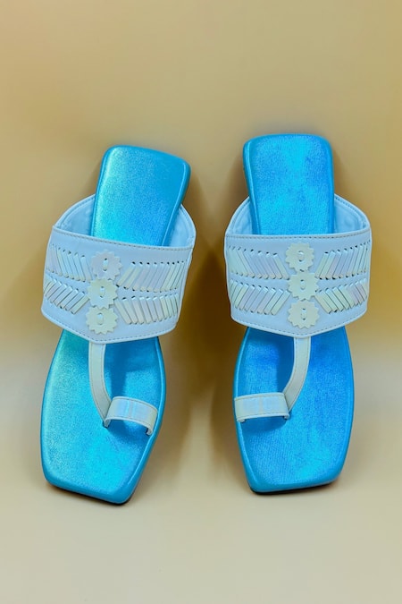 Blue kolhapuri sandals featuring a braided woven strap and square toe detailing