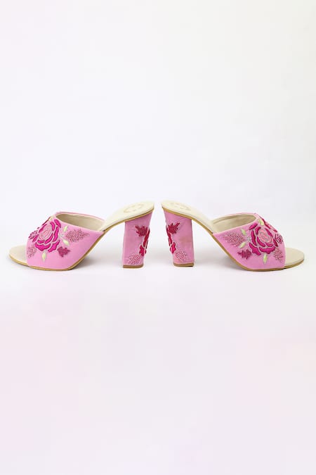 Pink block heels featuring floral embroidered motifs with an open toe design