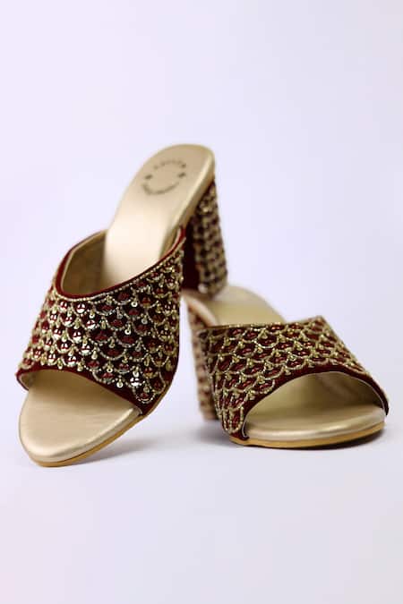 Maroon block heels featuring sequin and cutdana hand embroidery with an open toe design