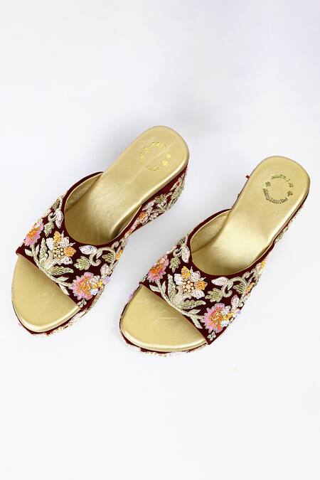 Buy_Shiveen Shiveen_Maroon Embroidered Floral Wedges _Online_at_Aza_Fashions