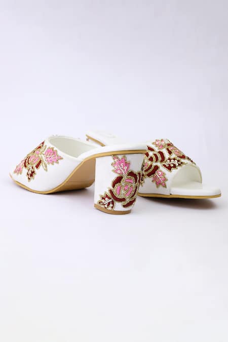 White block heels featuring floral embroidered motifs with an open toe and round front cut