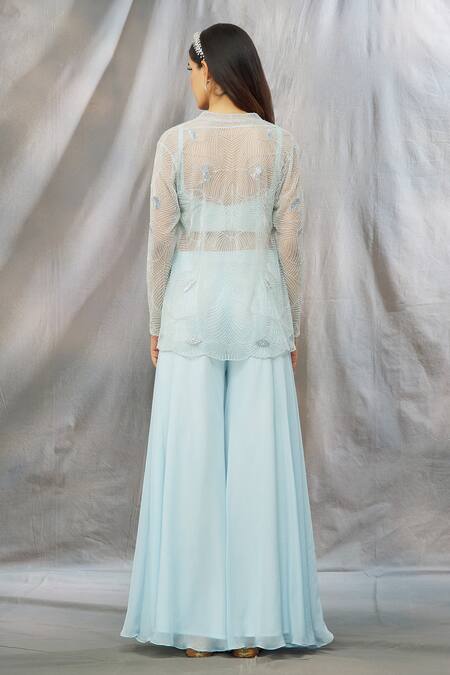 Blue Net Embroidered Cutdana Square Neck Jacket And Flared Pant Set