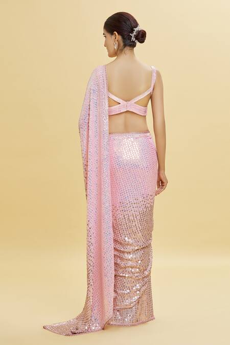 Bubblegum pink & copper brown saree in chiffon base with sequin embellishments. Comes with sweetheart neck wrap style cutdana sequin work padded blouse.