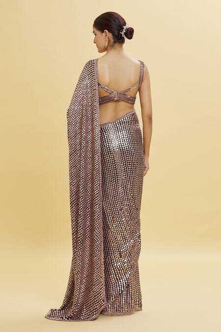 Black base saree with all over sequin coin embellishments. Paired with a blouse with all over sequin embellishments.