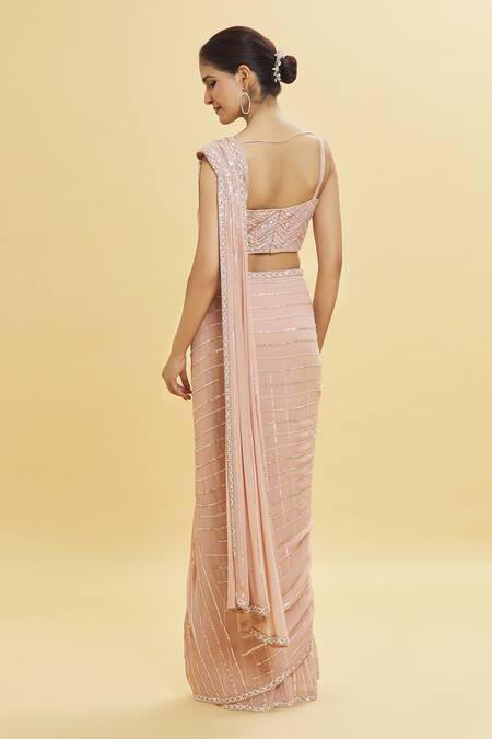 Blush pink pre-draped saree in georgette base with linear sequin embellishments & floral sequin embroidered borders. Comes with sleeveless strappy chevron pattern sequin work padded blouse.