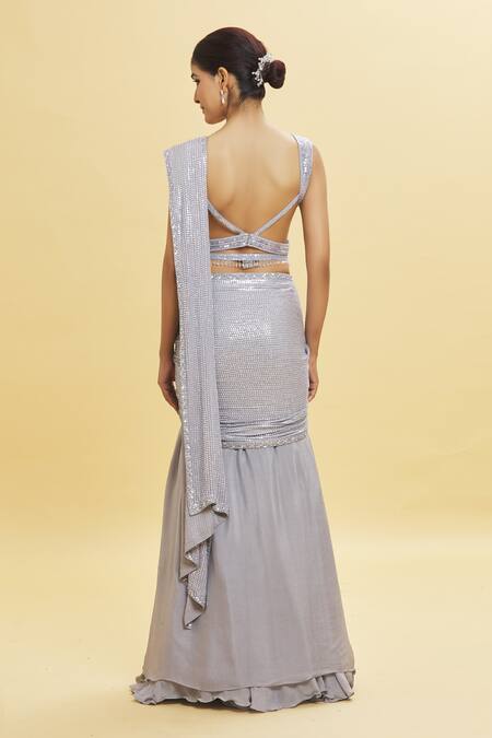 Ash grey pre-draped saree with sequin embroidered drape & ruffled waterfall front pleat on the front. Paired with sequin sleeveless cut out padded blouse & tassel belt.