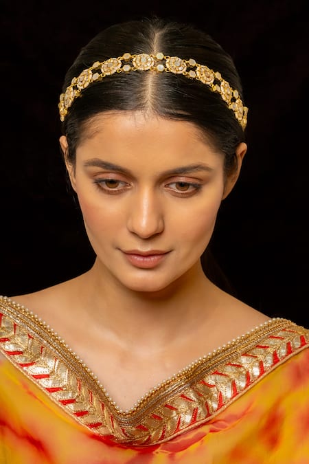 White mathapatti featuring handcrafted pearl embellishments and a lock hook closure