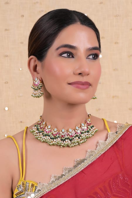 Multi Color Stones, Pearls Gold Plated Abstract Motif Choker Set