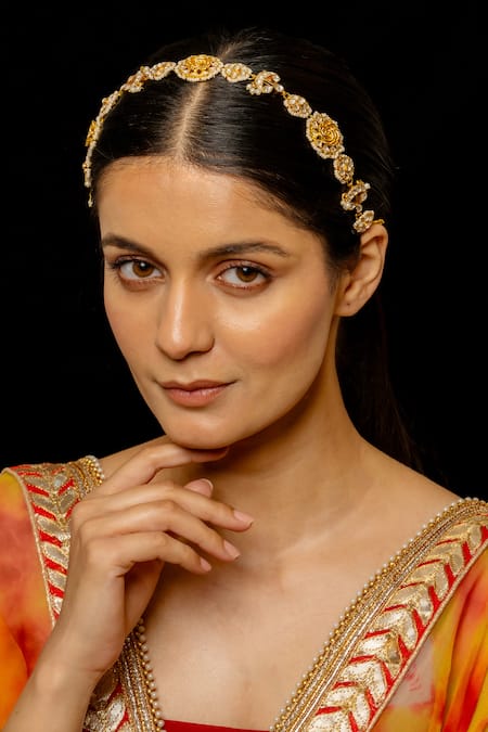 Gold plated gulaab carved mathapatti featuring kundan units and pearl lining embellishments