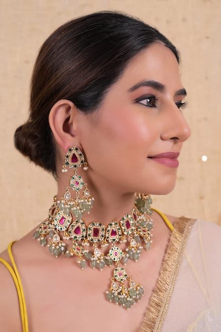 Multi color necklace featuring geometric cutwork motifs with kundan, semi precious stone, and gemstone embellishments. Paired with matching earrings for a complete look.