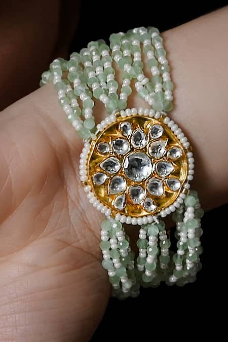 Mint green bracelet featuring multiple strands of beads and a central Kundan embellishment. Designed with a lock and chain closure for secure wear.
