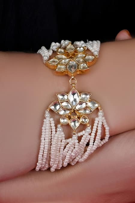White Crystals, Pearls, Stones Kundan Lotus Multistrand Bracelet