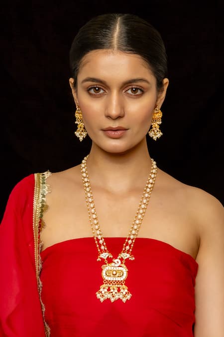 Multicolor necklace featuring a peacock carved cutwork pendant with kundan, semi-precious stones, and bead drops. Paired with matching earrings adorned with similar embellishments.