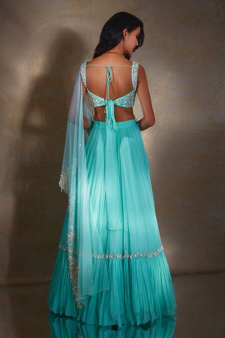 Tiffany blue lehenga saree featuring a tiered design with bead tassels and an attached sheer drape. Highlighted by gradient sequin bead embellishments, it comes with a matching embellished camellia patterned blouse.