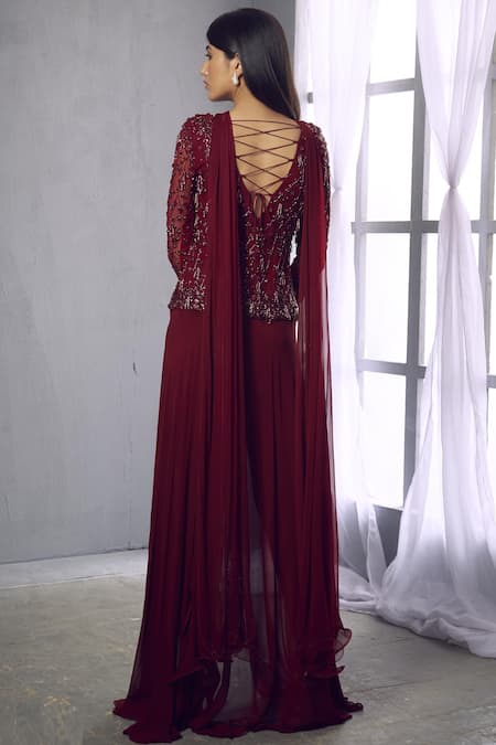 Buy_Shloka Khialani_Maroon Net, Crepe, Georgette V Neck Embellished Jacket And Pant Set _at_Aza_Fashions