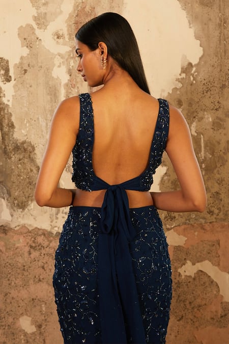 Blue crop top with floral embellishment. Paired with fish style skirt.