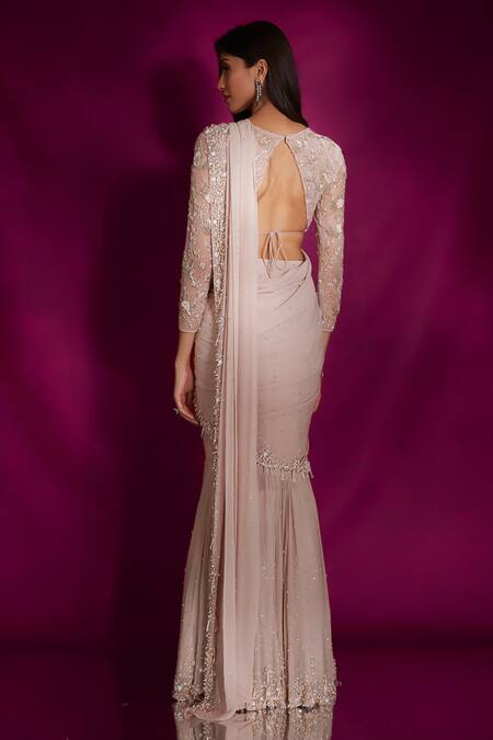 Pink pre-draped saree featuring crystal and bead cluster embroidery. Paired with an embellished sheer panel blouse with a cut-out back design.