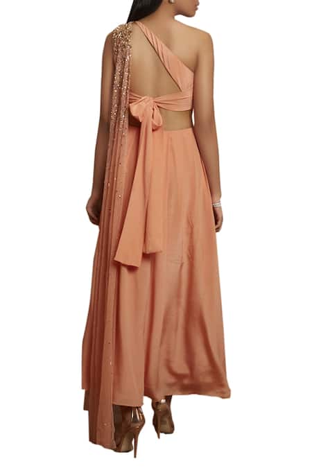 Peach Net, Crepe, Cotton Satin One Shoulder Kurta Set