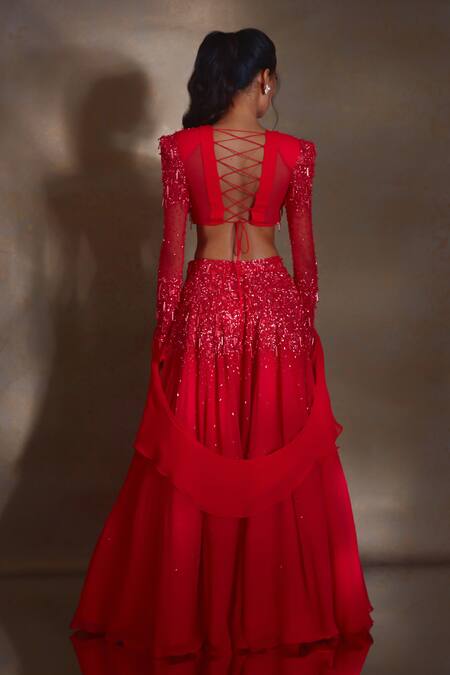 Red lehenga featuring placed sequin, bead and crystal cluster embroidered waistline. Paired with an embellished blouse and ruffle dupatta.