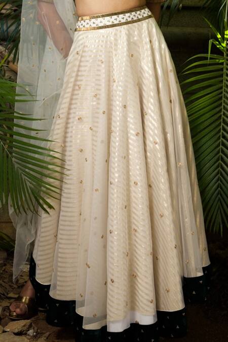 Off white lehenga with striped detail & embroidered motifs. Paired with embroidered bottle green velvet blouse & embroidered dupatta.
