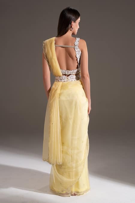 Yellow Organza, Suede Floral Scallop Saree With Blouse