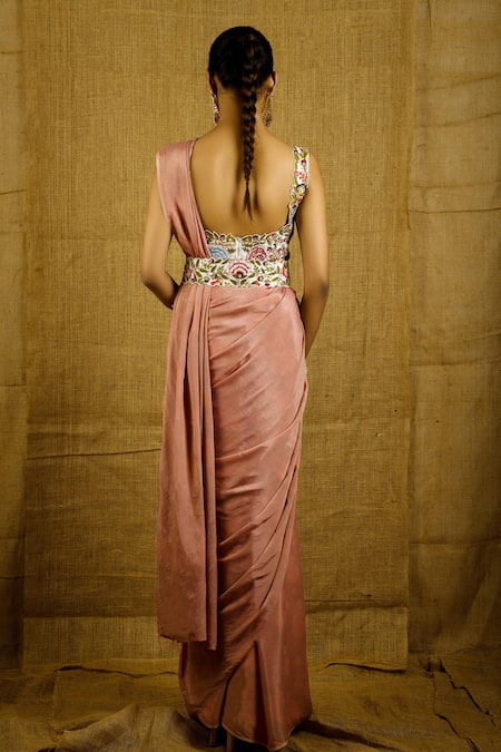 Rustic saree with all-over floral self-print. Comes with ivory embroidered blouse and corset belt.