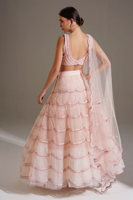 Pink Organza, Net Scallop U Neck Embroidered Lehenga Set