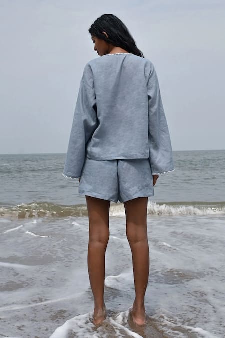 Blue Linen Embroidery Round Neck Arlo Flared Sleeve Top