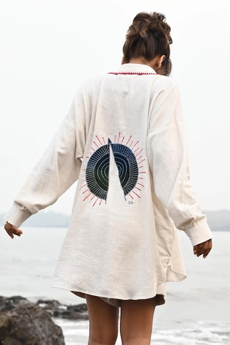 Beige shirt made from 100% linen featuring a collared neckline with embroidered details and patch work at the back