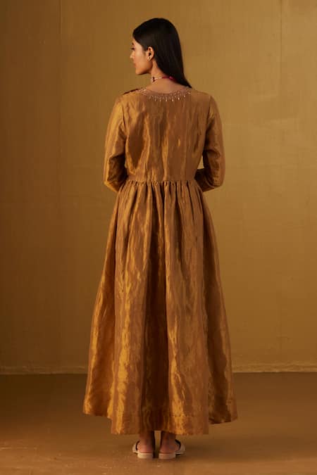 Gold Anarkali featuring full sleeves and round neckline with zardozi embroidery