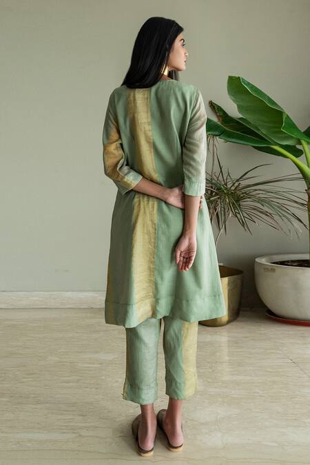Green kurta featuring broad and slim blocks of gold and silver zari woven motifs. Paired with matching pants, this set is made from Zari Jamdani Striped Muslin with a Shantoon lining.