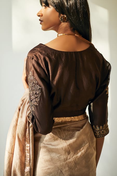 Bark brown blouse with zardozi embroidered motifs on the sleeves.