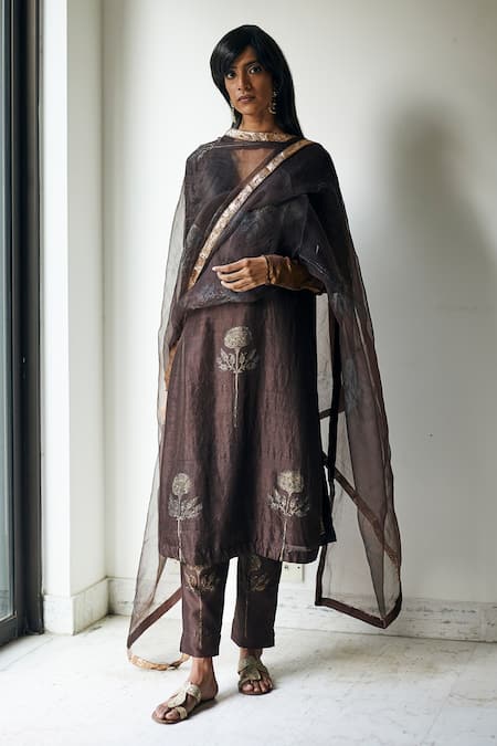 Dark brown straight kurta with floral block printed motifs and gold sleeve hems. Comes with straight pants.