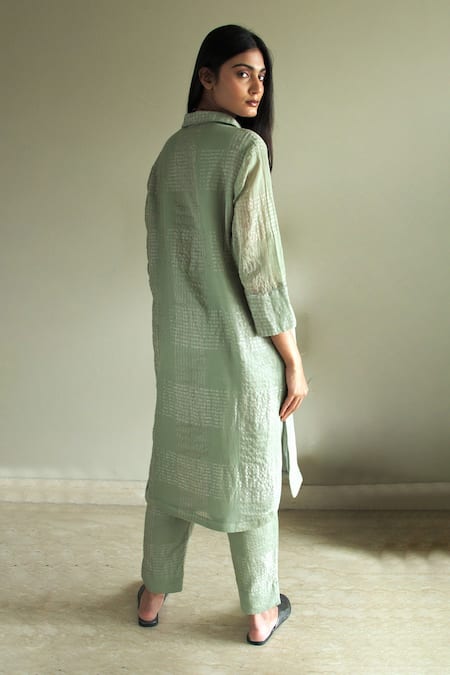 Buy_Shorshe Clothing_Green Muslin, Silk Zari Collared Checkered Woven Shirt Kurta And Pant Set_Online_at_Aza_Fashions