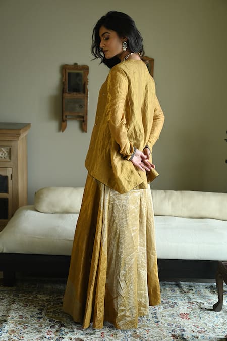 A gold tissue top featuring hand and machine embroidery with lace trims on the neck yoke, with a front length of 23 inches and back length of 29 inches. Paired with a gold tissue gharara with a partially elasticated waistband and a length of 43 inches.
