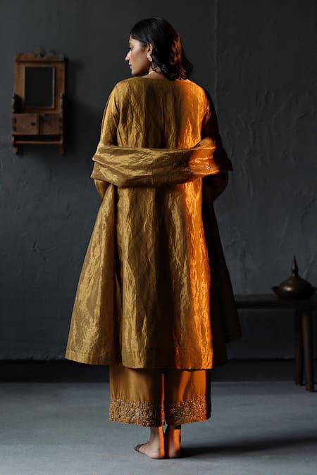 Buy_Shorshe Clothing_Gold Handloom Tissue Lining Shantoon V Neck Flared Kurta And Farshi Pant Set _Online_at_Aza_Fashions