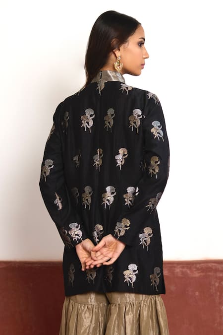 Black kurta featuring a polo neck, full sleeves, and floral woven patterns. Paired with a handloom tissue sharara with a partially elasticated waistband.