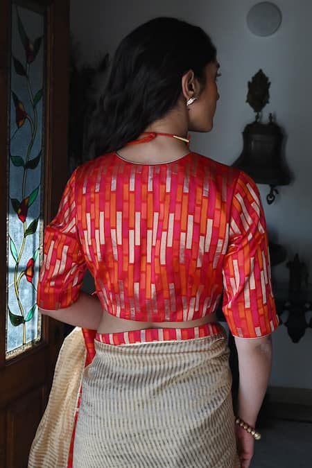 Buy_Shorshe Clothing_Red Brocade, Satin Piping Round Neck Geometric Linear Pattern Blouse_at_Aza_Fashions