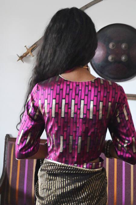 Purple and black blouse featuring a geometric linear woven pattern with silver piping at the hem