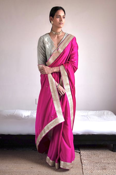 Intricate pearl hand embroidery on the saree, Gota lace work border adds a touch of elegance