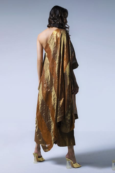 Gold one shoulder cape crafted in handloom tissue lurex stripes